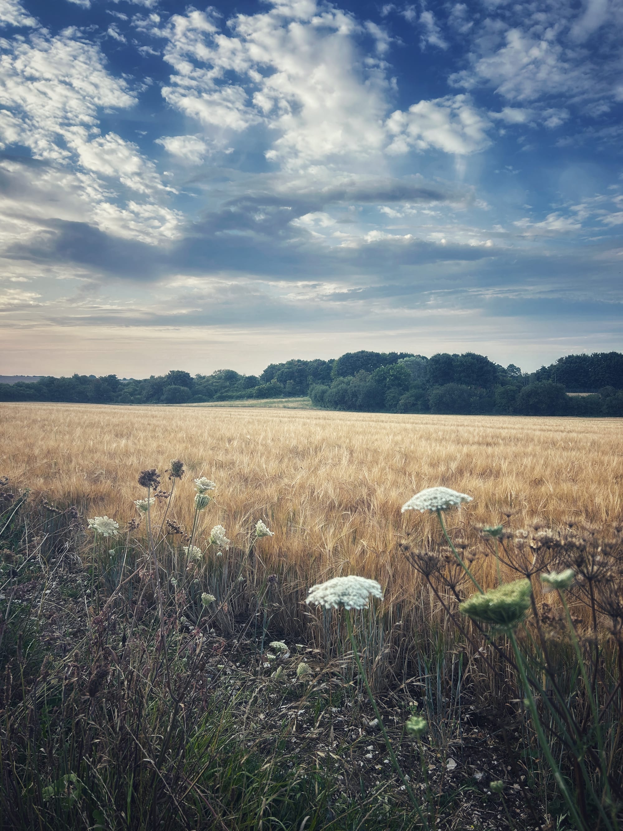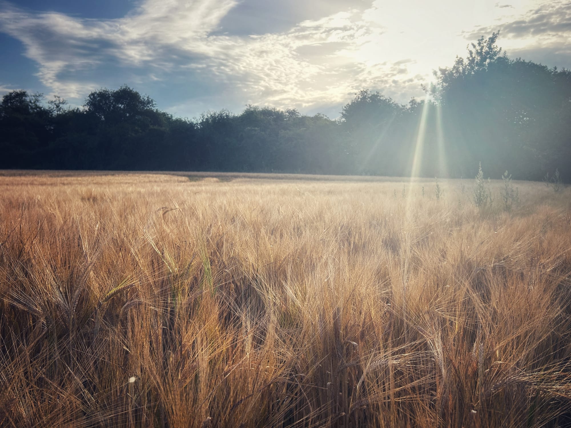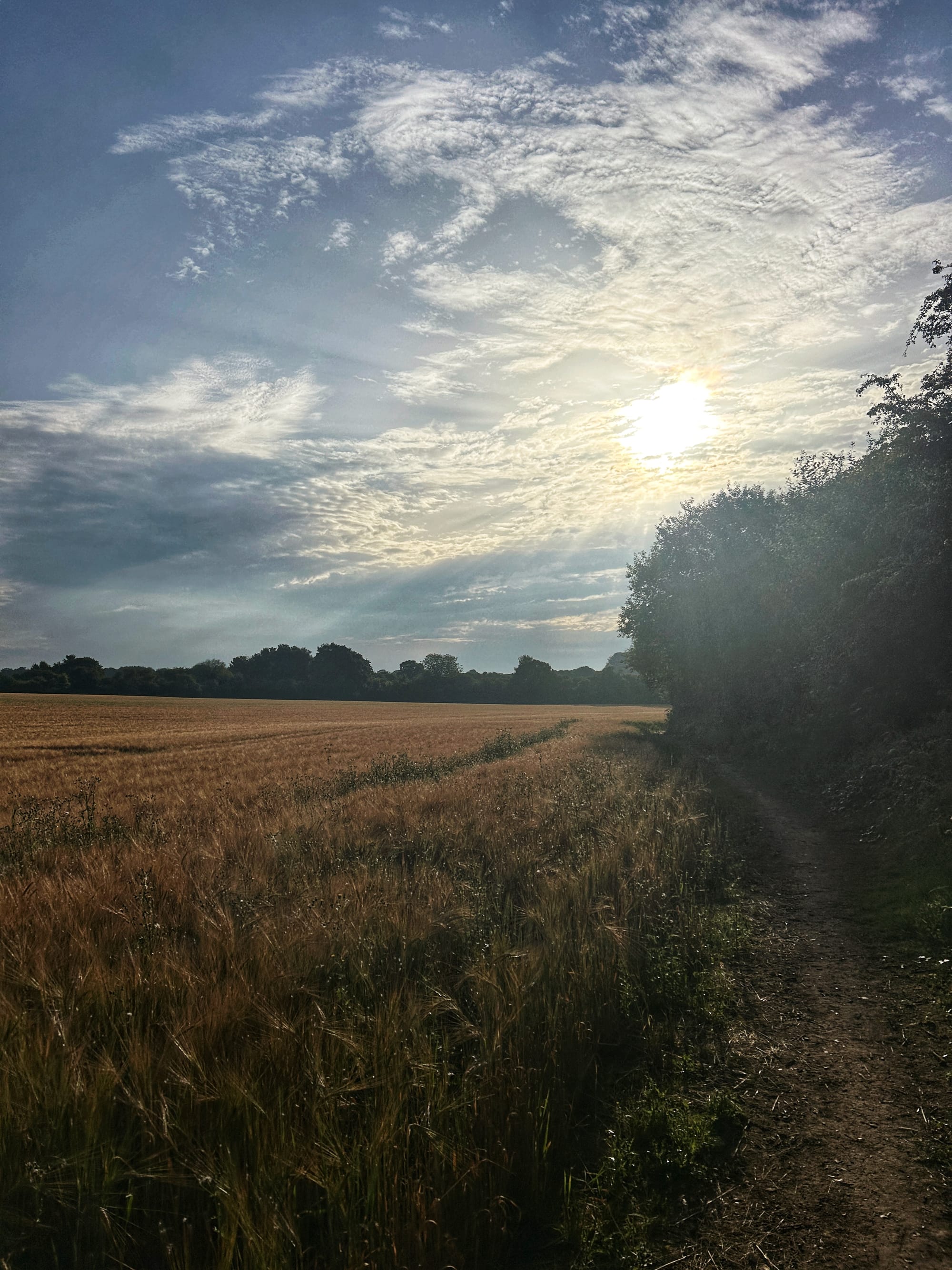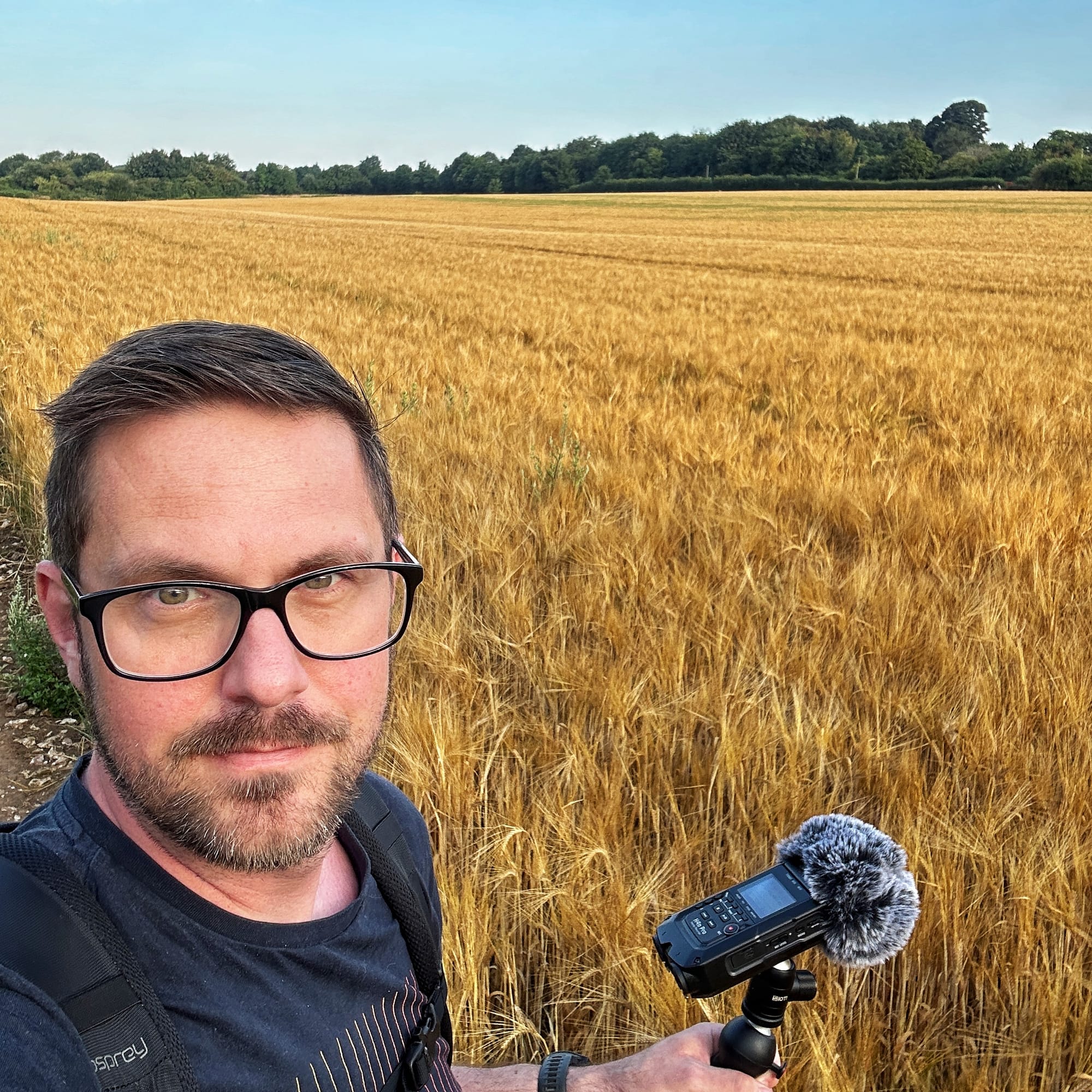 I'm gonna head back across one of the big open fields in the baking heat. Probably record a little bit of nature, maybe some sounds of the, barley, I think it is, that they're growing. Flying in the wind, there's a little bit of a breeze today. No doubt there'll be some dog walkers and other people wandering around. I always look a bit silly because I wear my headphones.