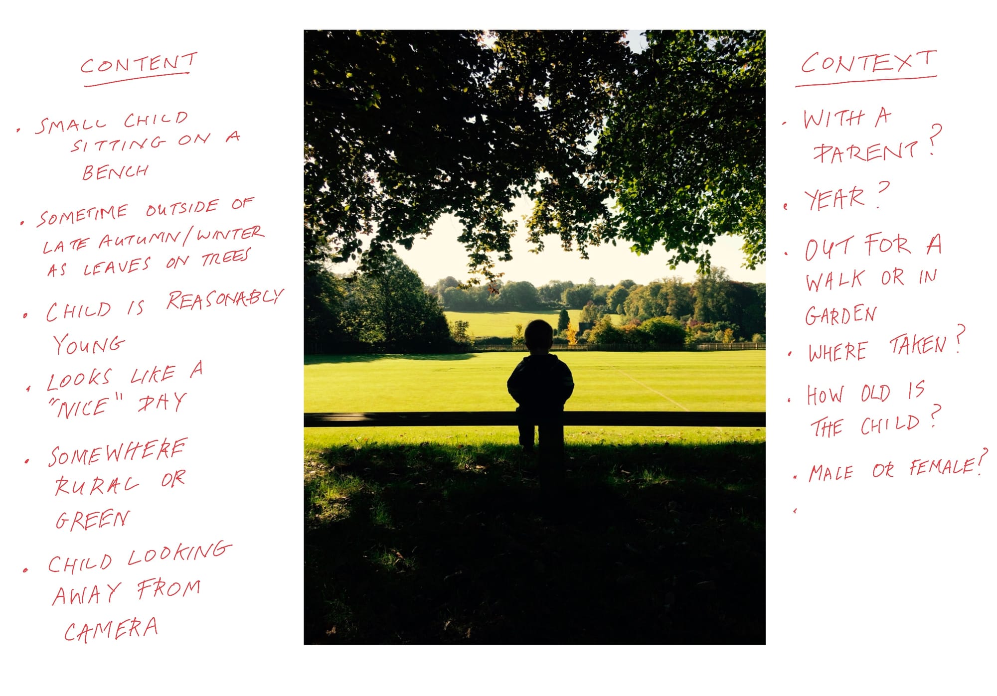 For example, if we look at this photo here of a child sitting looking out over some fields, we can describe the content of the photograph. We can deconstruct it and come up with some descriptions about the photograph.
