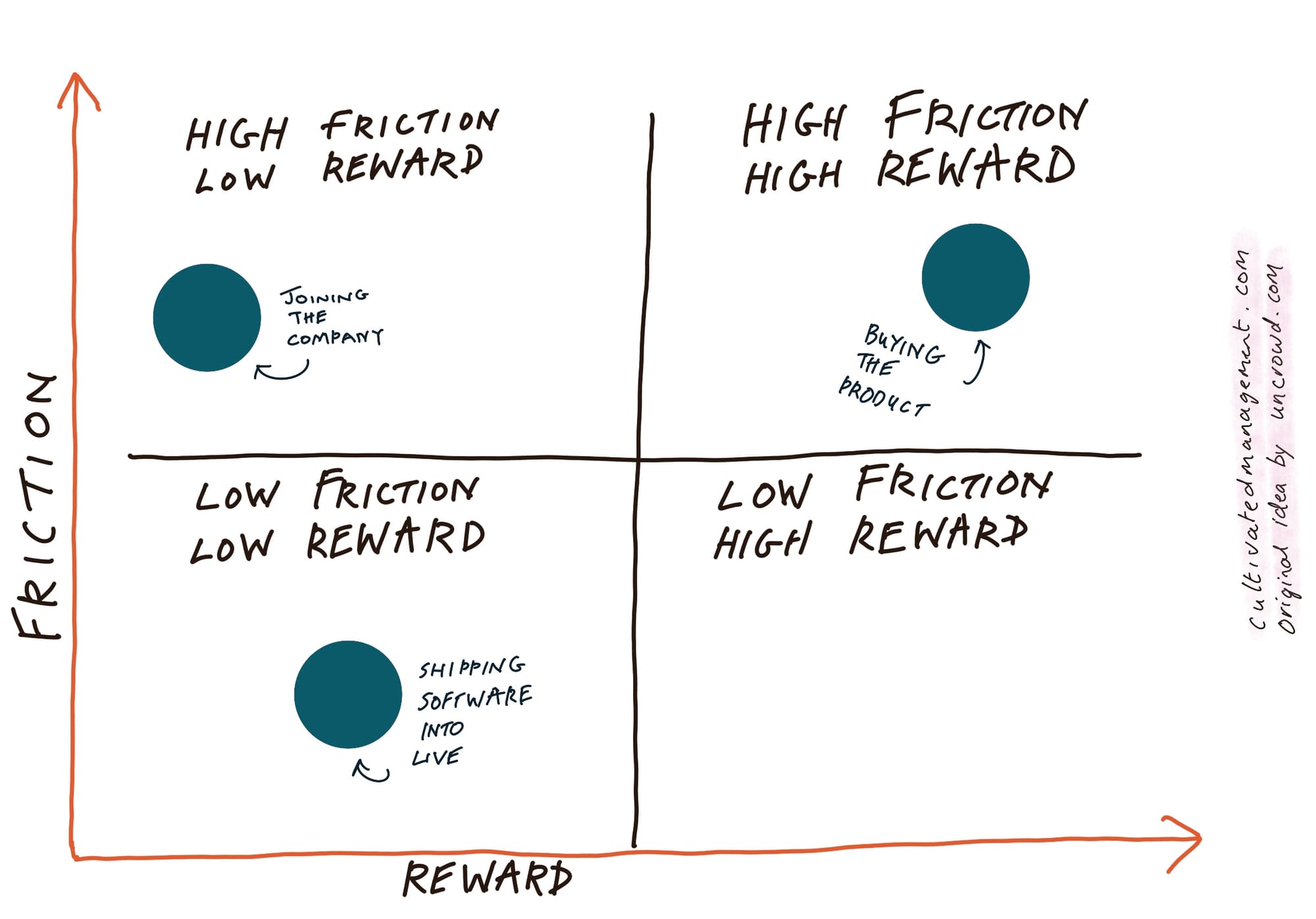 The trick to making this model work is by deeply, truly studying the problem, initiative, customer journey, product support - whatever - and understanding what the friction is (and where it comes from), and carefully looking at the reward.