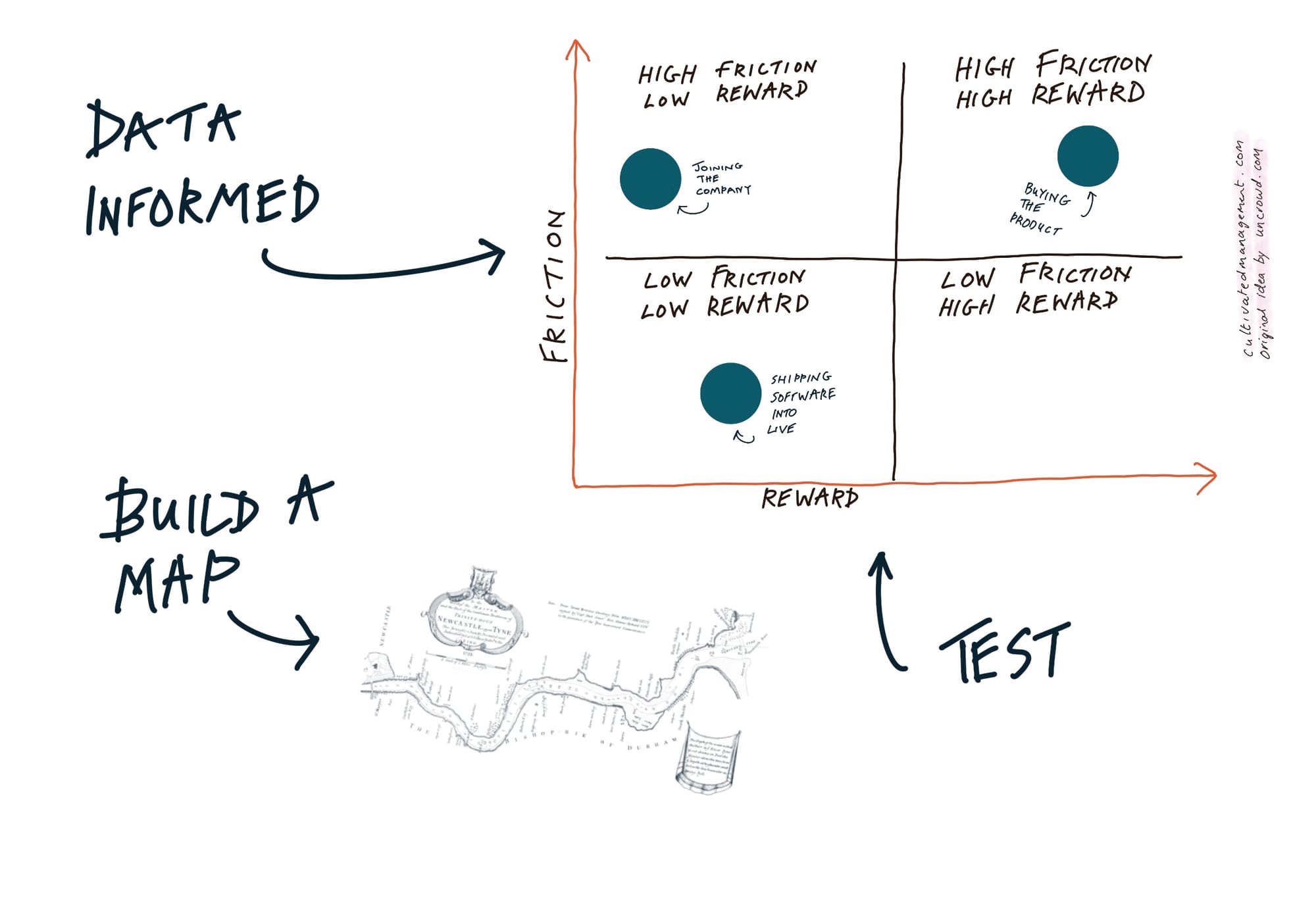 The reward is low or high or whatever the reward is. We need to come together to try and address this friction, to solve it, to move it from that top left where it's high friction, low reward, and move it to another part of the quadrant. So that's where that analysis and that data is really important. Then if you do get buy in and you get support for it, you need to have a plan and a map, as I would call it, on how you're gonna deliver it and then testing that all the way through that process. Now a good question that Richard asked in the book, will this change make fewer or more customers happier?
