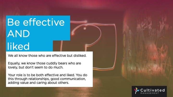 Be effective and liked and you will go far. To thrive in your career it’s pretty important to deliver business results AND be liked in the process.