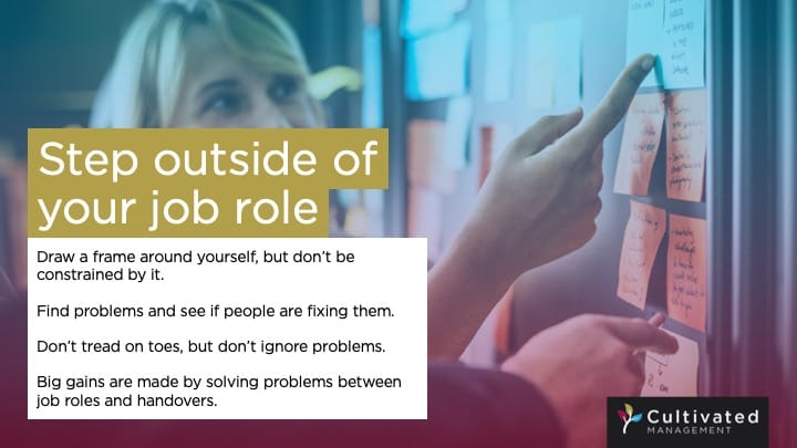But in many organisations the most compelling, interesting and high impact problems often exist between job roles. They exist between well-defined and well clung to roles. Nobody owns the problems; people try to kick them to each other or simply ignore them. Not in my job description.