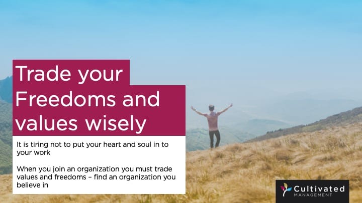Trade them wisely, but be aware, we must always flex. There will always be things we need to compromise on. So, work out which values are unmovable and which ones you’re more flexible about. But don’t give up your values for the organisation – you’ll be miserable. There are plenty of different ways of working out there. Our goal is to find a place of work we resonate with.