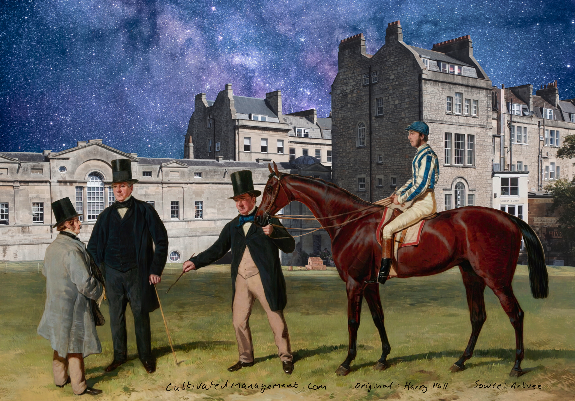 I couldn't decide which background looked better. The first with a cityscape, or the second with an image taken in Bath, England, which itself has star skies behind it. Original painting by Harry Hall on Artvee.